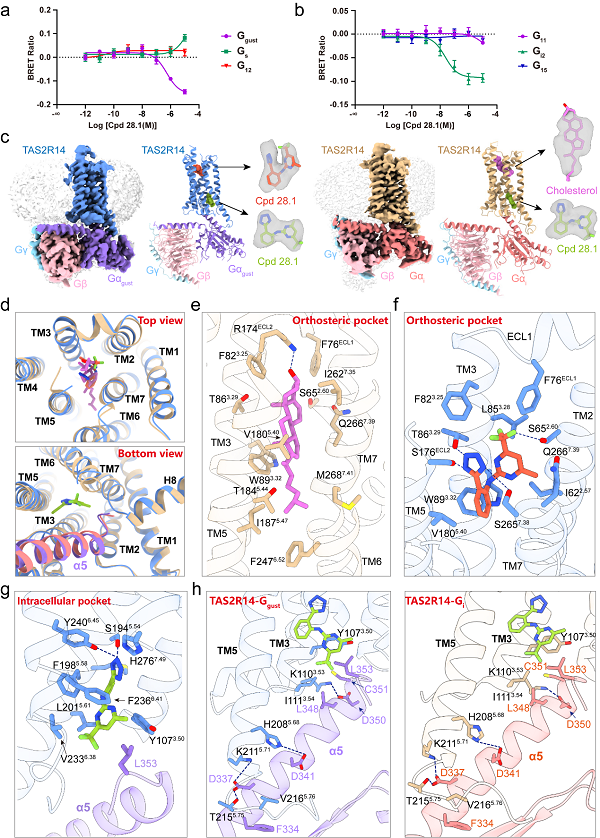 本项研究指出,Cpd 28.1激活TAS2R14不仅能够招募味觉受体特异的G蛋白Ggust,而且还具有显著的Gi2招募活性(Fig. 1)。上述实验结果与文献报道相契合11,提示苦味受体TAS2R14可能在口腔外周组织通过偶联Gi发挥G蛋白信号依赖的生理功能。