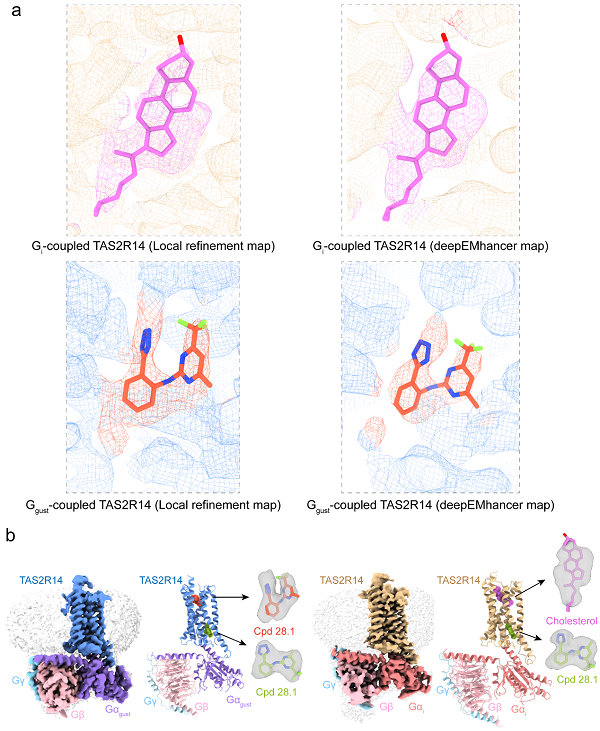 2024年7月5日,中科中山药物创新研究院段佳课题组、李翼课题组联合中国科学院上海药物研究所徐华强课题组、生命过程小分子调控全国重点实验室杨德华课题组共同在Cell Research 上发表了题为“Bitter taste receptor TAS2R14 activation and G protein assembly by an intracellular agonist”的最新研究成果。该研究报道了非甾体抗炎药物氟芬那酸改造化合物Compound 28.1(Cpd 28.1)结合苦味受体TAS2R14分别偶联Ggust和Gi复合物结构,分辨率高达2.89埃和2.7埃,揭示了苦味受体独特的双口袋配体识别和G蛋白偶联机制。