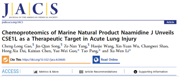 2024年9月16日,中国科学院上海药物研究所生命过程小分子调控全国重点实验室/烟台新药创制山东省实验室海洋药物研发中心郭跃伟/李序文研究团队联合中国药科大学多靶标天然药物全国重点实验室庞涛研究团队在Journal of the American Chemical Society上发表题为《Chemoproteomics of Marine Natural Product Naamidine J Unveils CSE1L as a Therapeutic Target in Acute Lung Injury》的最新研究成果。该研究通过化学蛋白质组学结合ABPP技术发现了海洋天然产物naamidine J (NJ)抗炎新功能的直接靶标为CSE1L,并通过定量蛋白质组学、分子生物学和过继转移等实验揭示了NJ通过作用于CSE1L靶标H745和F903位点,从而抑制SP1的核易位和转录活性,进而发挥抗炎和抗急性肺损伤的治疗效果。