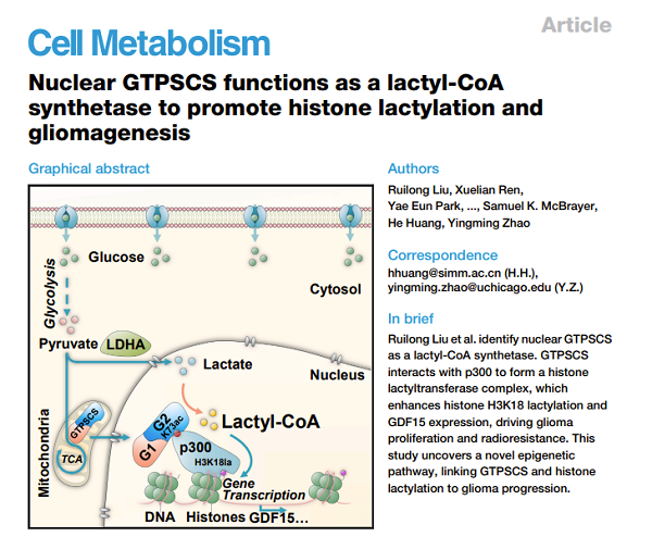近日,生命过程小分子调控全国重点实验室黄河课题组与芝加哥大学赵英明教授团队合作,鉴定了乳酰CoA合成酶GTPSCS,并揭示了GTPSCS/p300/H3K18la信号轴协同调控组蛋白H3K18la水平和GDF15表达,促进胶质瘤细胞增殖和放射耐药的表观遗传新机制。该成果于2024年12月5日以“Nuclear GTPSCS functions as a lactyl-CoA synthetase to promote histone lactylation and gliomagenesis”为题发表在Cell Metabolism杂志上。