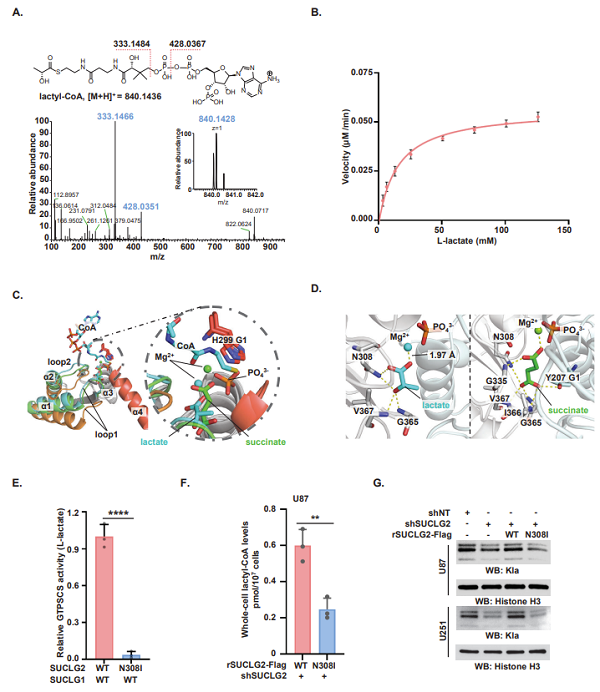 本项研究中,科研人员首先通过在细胞水平上筛选12个脂肪酰基辅酶A合成酶,发现琥珀酰辅酶A合成酶GTPSCS能够显著调节组蛋白Kla水平,并与胶质瘤的分级和预后相关。GTPSCS通常被认为是一种线粒体合成代谢酶,在肝脏的合成代谢过程中发挥作用。鉴于GTPSCS对组蛋白Kla的影响,作者推测GTPSCS可能具有乳酰辅酶A合成酶活性。为证实这一推测,首先开展了体外酶活实验进行验证,结果表明GTPSCS可催化乳酸形成乳酰辅酶A,其米氏常数(Km)为15.32 ± 1.28 mM。其次,晶体衍射结果显示GTPSCS主要通过N308位置氢键与乳酸相互作用结合(图1)。