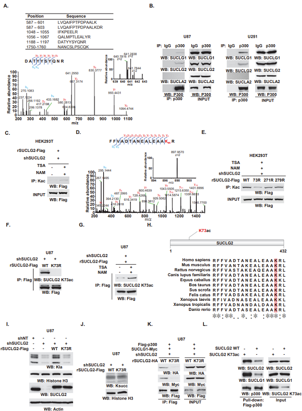 乳酸和乳酰辅酶A是调节组蛋白乳酰化修饰的关键前体。研究表明乳酸主要在胞浆中通过糖酵解产生,然而,组蛋白乳酰化修饰却发生在细胞核中,细胞核内的乳酰辅酶A是在胞质中生成后再进行核易位,还是在细胞核中重新合成尚不清楚。作者通过免疫荧光染色发现GTPSCS能进行核易位,且依赖于G1亚基的核定位序列。为了进一步揭示GTPSCS介导组蛋白乳酰化修饰的机制,作者通过亲和纯化质谱以及体外免疫共沉淀等实验验证GTPSCS的G2亚基残基K73的乙酰化介导其与p300的相互作用(图2)。为了确定p300/ GTPSCS调控的组蛋白Kla修饰位点,作者通过基于SILAC的定量蛋白质组学发现H3K18la是核GTPSCS/p300复合体调节的主要组蛋白Kla位点,且不调控H3K18succ的水平。以上数据表明,GTPSCS核定位以及K73ac修饰是形成活跃的GTPSCS/p300核复合物以进行组蛋白乳酰化反应所必需的。