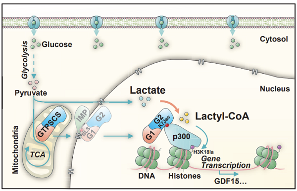 为了探讨GTPSCS对胶质瘤形成的影响,研究者进行裸鼠皮下异种移植实验,结果表明G1亚基的核定位信号和G2亚基的K73ac是GTPSCS调节组蛋白Kla水平,促进胶质瘤细胞增殖和肿瘤发展的关键。其次,研究者通过检测170例胶质瘤临床组织中H3K18la与核内GTPSCS的水平,发现两者表达呈正相关。该研究表明GTPSCS作为乳酰辅酶A合成酶易位进入细胞核并与p300相互作用调控组蛋白乳酰化,这一过程依赖于GTPSCS G1亚基的核定位信号和G2亚基K73的乙酰化,GTPSCS/p300协同调节组蛋白H3K18la和GDF15的表达,促进胶质瘤进展(图3)。