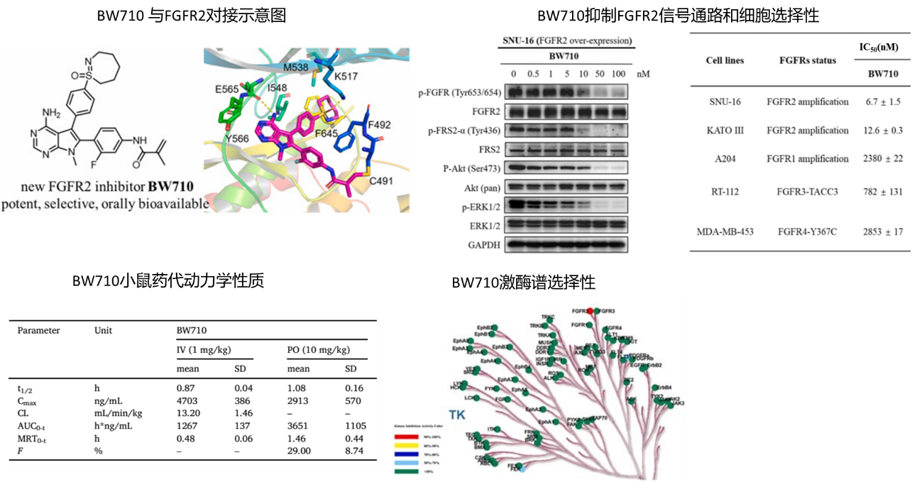 近日,中国科学院上海有机化学研究所生命过程小分子调控全国重点实验室马大为院士和丁克教授团队根据他们自己前期所报道的FGFR2选择性抑制剂LHQ490 (Eur. J. Med. Chem. 272 (2024) 116473),成功设计合成了全新的候选先导分子BW710,相关成果以“Discovery of BW710 as a potent,selective and orally bioavailable fibroblast growth factor receptor 2 (FGFR2) inhibitor”为题发表在药物化学领域专业期刊Eur. J. Med. Chem.。BW710对BaF3 - FGFR2的增殖抑制作用显著,IC50为2.8 nM;在 1 μM浓度下,BW710展示出优异的靶标特异性,对其他75种酪氨酸激酶抑制率较低。同时,在小鼠体内BW710展现出较好的药代动力学性质,口服生物利用度为29%。