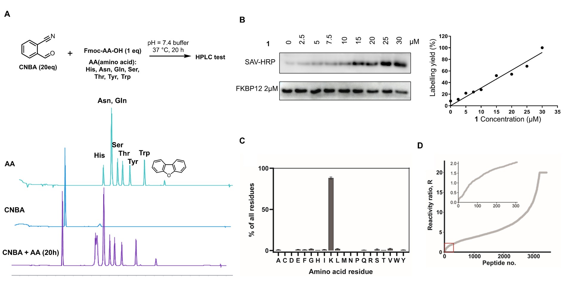 基于该思路,团队验证了CNBA在生理条件下对赖氨酸修饰的反应活性和选择性,结果证明CNBA能实现FKBP12的有效标记,同时全蛋白组的修饰位点检测结果说明CNBA具有非常优异的氨基酸选择性。且能成功标记Jurkat细胞内3451个的赖氨酸残基,其中包括多个具有高反应活性的赖氨酸残基位点。