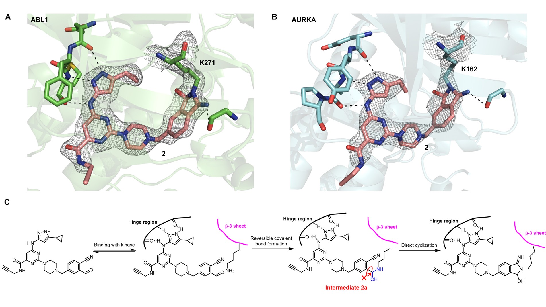 在此基础上,课题组将CNBA应用于激酶共价抑制剂中。蛋白质组学和共晶结果表明,基于CNBA的广谱激酶抑制剂K-CNBA-1能与Jurkat细胞内85个激酶的保守赖氨酸形成不可逆共价作用,该结果为开发靶向激酶内部赖氨酸的共价抑制剂提供新的方法。