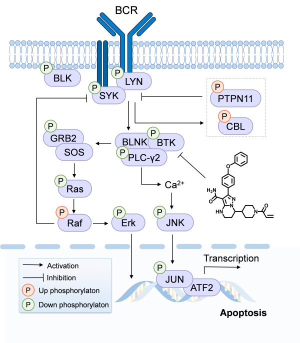 图3.泽布替尼抑制或激活的蛋白激酶及其参与的细胞过程