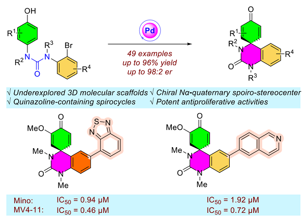 手性螺环是一类重要的药物优势骨架,广泛存在于活性天然产物、上市药物或候选药物分子中,常常具有重要的生物活性。其独特的三维结构可显著增强小分子与生物大分子的相互作用,在改善药物靶向性、代谢稳定性及生物利用度方面展现出独特优势。因此,如何高效构建结构复杂的手性螺环骨架仍具一定挑战,也是有机合成领域研究的难点和热点之一。含氮杂环喹唑啉结构是药物重要的药效团之一,表现出多种药理活性包括抗癌、抗菌、抗病毒等。喹唑啉骨架在FDA批准的最常出现的35种含氮杂环药物名单中排名第17位,在药物开发过程中起着重要的作用。
