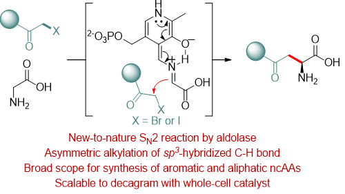 双分子亲核取代(SN2)反应与羟醛缩合反应是有机化学及生物化学合成中的核心反应类型。然而,它们的反应机制具有根本性的差异。自然界分别进化出了专一的酶家族催化这两类反应:即催化羟醛缩合的醛缩酶,以及催化SN2途径的甲基转移酶等类似酶。在此之前,尚未报道醛缩酶能够催化SN2取代反应。