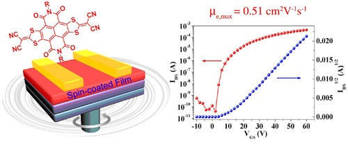 近年来,有机薄膜场效应晶体管(OTFT)因其在轻薄、可弯折、个性时尚的有机电子产品方面有广阔的应用前景, 成为有机电子学中的研究热点。p-型和n-型有机半导体材料对于OTFT的发展同等重要,因为由p型和n型OTFT共同构筑的有机互补电路具有功耗低、操作速度快、噪音容限大等优点,可广泛用于各种有机数字电路,是实现有机电子器件应用的基础。然而,目前n-型有机半导体材料的发展远远落后于p-型有机半导体材料,具有高电子迁移率、空气稳定、可溶液加工性质的n-型有机半导体材料极为短缺,大大限制了OTFT相关的柔性电子器件及有机电路的发展。