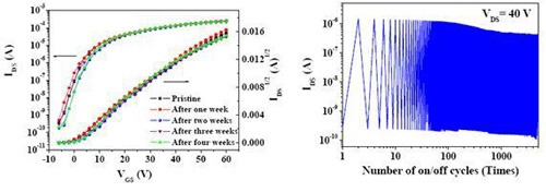 不同于以往在缺电子的芳核上直接引入拉电子基团(如氰基、氟原子)来设计n-型有机半导体材料的方法,上海有机所高分子材料研究室的研究人员采用在缺电子的芳核上稠合富电子的硫杂环(提高迁移率),并结合拉电子的丙二氰基团封端的策略(保证稳定性),发展了一类新的可溶液加工的n-型有机半导体材料,2-(1,3-二硫-2-叶立德)丙二氰稠合的萘酰亚胺衍生物(图1,R为长的分支烷基),他们与化学所有机固体院重点实验室的研究人员合作,用溶液加工的方法制备了该类分子材料的OTFT器件,电子迁移率高达0.51 cm2V−1s−1,开关比大于105,阈值电压低于10 V,且器件具有良好的空气稳定性和操作稳定性(图2),器件的迁移率和稳定性在已报道的可溶液加工的n-型有机小分子材料中是最好的。相关工作申请了中国发明专利,部分结果以通讯的形式发表在《美国化学会志》(J. Am. Chem. Soc. 2010, 132, 3697-3699)上。