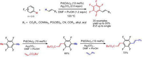 近年来过渡金属催化的交叉偶联反应作为一种高效、有力形成C-C键的手段已在不同领域受到广泛应用,但是对于有机氟化学来说这一方法却存在很大局限。其主要原因在于过渡金属与高缺电子含氟基团,例如五氟苯之间形成的s键(M-C6F5)略带离子键性质,其键能十分高,难于发生断裂,从而导致催化循环很难进行(J. Am. Chem. Soc. 2009, 131, 7817)。这极大限制了利用过渡金属催化的手段来促进有机氟化学的发展。此外,虽然目前对芳烃直接进行C-H活化烯烃化的反应已有大量报道,然而其大多局限于富电子芳烃,对于具有无导向基团缺电子芳烃的该类反应却十分少见。因此,发展能够在催化条件下实现高效简捷直接与多氟芳烃键合形成C-C键的反应十分必要。