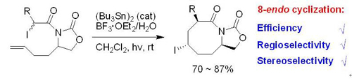 最近,上海有机所天然产物合成化学院重点实验室研究人员发现,在路易斯酸的促进下,α-酰胺基自由基可以高效地进行8-endo环合反应,高区域及立体选择性地生成相应的八元环内酰胺 (J. Am. Chem. Soc.2010, 132, 2274 - 2283)。该反应具有较为广泛的底物适用性,因而有着良好的有机合成应用前景。该研究获得国家自然科学基金的支持。