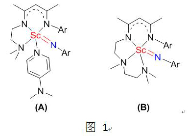 上海有机所金属有机国家重点实验室陈耀峰课题组基于有机配体的电子效应和立体效应,针对稀土金属离子硬酸、大离子半径和高配位数的特性,设计合成了一类新型的三齿氮配体, 并通过合成其稀土金属烷基配合物,验证其确实具有优越的电子效应和立体效应特性(Organometallics 2008, 27, 758)。在此基础上,利用该类配体,在外加Lewis 碱DMAP的配合下,成功地合成了第一例稀土金属末端氮卡宾配合物-钪末端氮卡宾配合物(图1,A),并对这个配合物进行了X-射线晶体结构的表征和DFT理论计算。有关结果以封面文章的形式发表在(Chem. Commun., 2010, 46, 4469)。进而又设计了一个新型的四齿氮配体,无需外加Lewis 碱就可以得到稀土金属钪末端氮卡宾配合物(图1,B)。