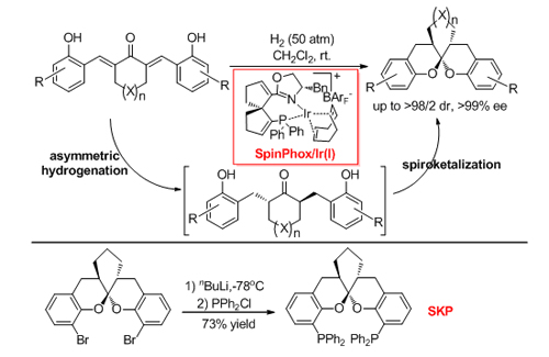 手性芳香螺缩酮是一些天然产物、生物活性化合物和手性配体的重要结构单元,虽然已有一些合成方法报道,但如何直接通过催化过程对映选择性地获得手性芳香螺缩酮一直没有可行的方法。上海有机所金属有机化学国家重点实验室丁奎岭课题组运用他们发展的SpinPhox/Iridium(I)催化剂(Angew. Chem. Int. Ed.2009, 48, 5345-5349),首次实现了通过α, α’-二(2-羟基亚芳基)酮的不对称催化氢化—缩酮化反应合成芳香螺缩酮化合物的方法(Angew. Chem. Int. Ed. 2012, 51, 936-940)。初步研究表明,手性铱络合物在该反应中具有双重作用:一是催化C=C双键的不对称氢化,二是促进反应中间体的缩酮化过程。此方法已被成功地应用于芳香螺缩酮骨架的手性双膦配体(SKP)的合成中。该工作发表后,德国化学家Reissig教授在《德国应用化学》杂志的Highlights栏目进行了专题评述,评价这一方法为“impressive and elegant approach”(Angew. Chem. Int. Ed. 2012, 51, 9486-9488),并期待有新的发展。