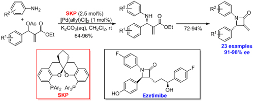 正如Reissig教授所预期,该课题组与中科院化学所刘利课题组合作,进一步将上述方法合成的手性SKP双膦配体成功应用于Pd催化的芳香胺对Morita-Baylis-Hillman加合物的不对称烯丙基胺化反应中,以高的化学收率及优秀的区域和对映选择性得到一类α-亚甲基-β-氨基羧酸衍生物,这些产物还可以方便地转化为相应的手性β-内酰胺化合物,为多种具有潜在生理活性分子的合成提供了有效的方法。同时,该催化体系还被成功应用于手性药物依泽替米贝(Ezetimibe)的不对称合成中,避免了传统方法中手性辅基的使用,简化了合成步骤。相关工作发表在Angew. Chem. Int. Ed. 2012, 51, 9276-9282上,有关成果还申请了4项中国发明专利。