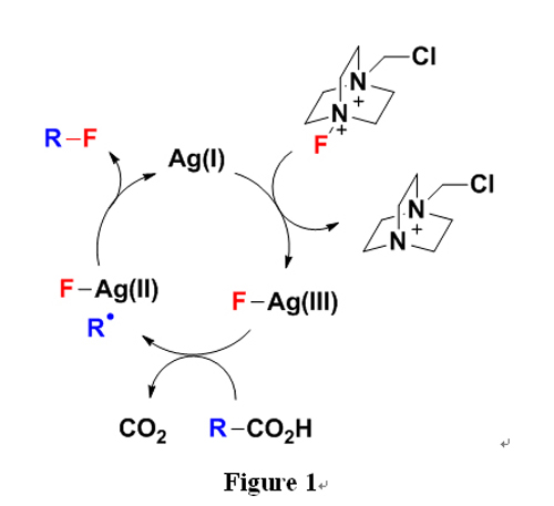 该氟代反应与前述氯代反应相似,均有着良好的普适性、官能团兼容性和化学选择性。不同的是,实验结果显示单纯依靠二价银离子介导的自由基过程并不能使氟代反应得以进行。与此同时,比较实验指出,烷基自由基与Selectfluor之间的反应是一单电子转移过程,在水相中不能有效地生成相应的氟代烷烃。因此,课题组提出了如下三价银介导的新颖反应机理:一价银离子与Selectfluor作用产生三价银的氟化物,进而与羧酸发生单电子转移,产生烷基自由基和二价银氟化物中间体。该烷基自由基攫取二价银氟化物的氟原子,从而得到氟代烷烃,同时再生出一价银离子(Figure 1)。这一机理首次提出“金属参与的氟原子转移自由基反应”这一概念,为C(sp3)–F 键的形成提供了一条崭新的思路和研究方法。可以预计,银催化的自由基氟代反应将在含氟有机小分子和氟材料的合成中发挥重要作用。这方面的研究正在继续当中。