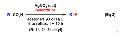 在上述工作基础上,课题组接着开展了脂肪酸的脱羧氟代研究。结果显示(Eq 3),以硝酸银为催化剂,商品化的试剂Selectfluor(全称为:1-Chloromethyl-4-fluorodiazoniabicyclo- [2,2,2]octane bis(tetrafluoroborate))为氟源,脂肪酸在室温至65 oC温度下即可在水相中脱羧氟代,以较高的效率生成相应的氟代烷烃(J. Am. Chem. Soc. 2012, 134, 10401–10404.)。温和的反应条件和十分简便的操作使该方法具有很强的实用性。