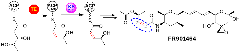 在I型聚酮合酶(PKS)或非核糖体聚肽合成酶(NRPS)催化的生物合成途径中,硫酯水解酶功能域(thioesterase,TE)通常分布于PKS或者NRPS的末端,链延伸完成之后催化聚酮链或者聚肽链的水解或者进一步的大环化。最近,课题组通过体外生化实验,首次证实了在FR901464聚酮链延伸过程中,位于PKS内部的一个TE功能域行使脱水酶(DH)的功能,催化了顺式双键的生成。进一步的实验证明,位于TE功能域下游的KS可以选择性将脱水之后的PKS链转移到后续的ACP上,进而进行下一步的链延伸(J. Am. Chem. Soc. 2014, 136, 4488-4491)。该结果不仅表明聚酮合酶功能域可能具有全新的功能,同时也揭示了聚酮天然产物中顺式双键形成的一种新机制。