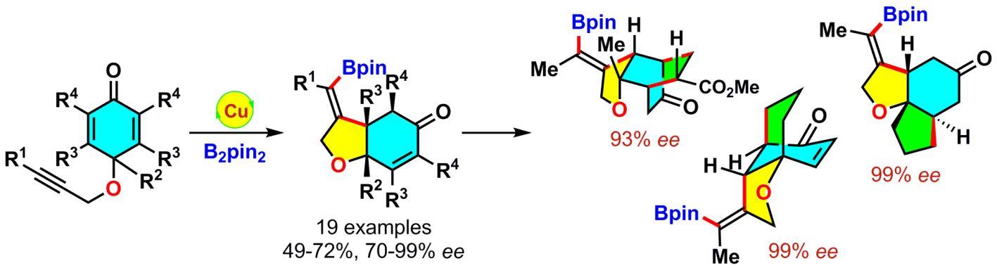 随后,该课题组又实现了非贵金属铜催化的含有环己二烯酮的1,6-烯炔的不对称硼化环化反应。该反应以优异的区域选择性和对映选择性得到了含有烯基硼酸酯和烯酮结构的顺式氢化苯并呋喃骨架。进而双环产物经简单的转化就可分别得到桥环和三环骨架(J. Am. Chem. Soc.2013,135, 11700)。该方法拓宽了铜催化的联硼酸酯的不对称串联反应。