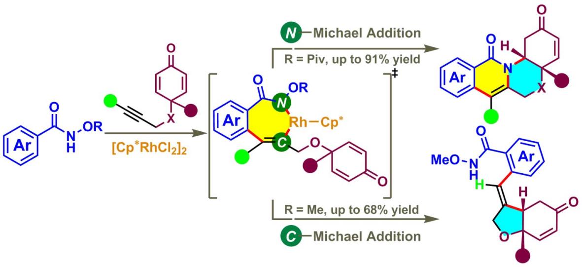 最近,该课题组成功地实现了三价铑催化的N-甲氧基以及N-特戊酰基氧苯甲酰胺和1,6-烯炔的可调控的芳化环化反应。首先,苯甲酰胺和1,6-烯炔在三价铑的催化下,通过C(sp2)H活化形成一个七元铑环中间体。当R为特戊酰基时,七元铑环中间体马上发生碳-氮还原消除以及氮-氧氧化加成的过程而生成异喹啉,异喹啉再发生氮杂Michael加成反应而构建了一个四环产物;另一方面,当R为甲氧基时,七元铑环中间体则不经历一个碳-氮还原消除的历程而直接经过碳-Michael加成反应而得到一个三环产物(J. Am. Chem. Soc.2014,136, 15607)。此外,通过对机理的仔细研究揭示了碳氢活化依然是这两个串联反应的决速步骤。