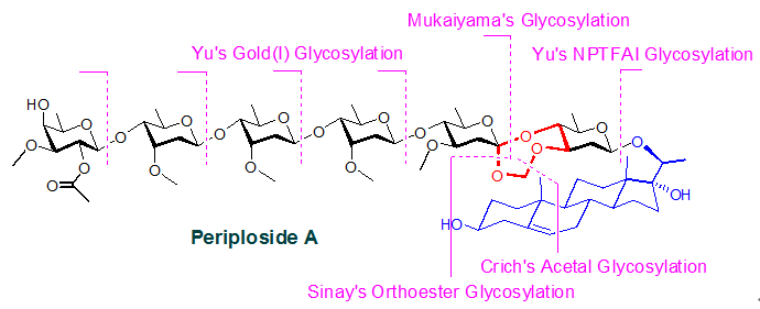 生命有机化学国家重点实验室俞飚课题组于近期实现了对杠柳苷Periploside A的首次全合成。该类化合物具有一个独特的亚甲基缩醛桥连的七元环原酸酯结构,这一前所未有的结构模块加之连续的2-脱氧-beta-糖苷键,使得它的化学合成极具挑战性。俞飚课题组利用分子内缩醛环化反应成功地构建了七元环原酸酯的核心骨架,并应用该课题组原创的三氟亚胺酯糖苷化和金催化糖苷化反应,完成了原酸酯二糖与甾体苷元的拼接以及脱氧四糖的延伸,最终以总计76步、线性最长29步和9.2%的总产率完成了全合成。该工作已于近日在《自然-通讯》杂志上发表(Nature Commun. 2015, 6:5879 doi: 10.1038/ncomms6879)。