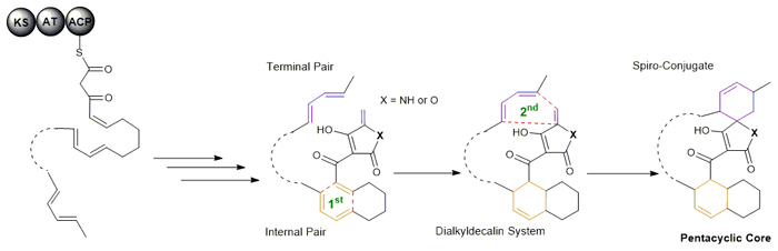 刘文团队最近的发现为回答这一科学难题创造了有利的契机。在螺环乙酰乙酸内酯/内酰胺抗感染抗生素的生物合成中,两种不同的[4+2]D-A环化酶以催化串联反应的方式,将具有两套共轭双烯与亲双烯体单元的线性中间体有效地转化为单一对映体的刚性五环骨架。与之前的例证不同,在没有相应的酶蛋白存在下,上述具有高度区域和立体选择性的[4+2]环加成反应无法自发发生,同时所依赖的酶蛋白功能单一、效率高,是非常理想的验证D-A反应生物催化机制的研究对象。