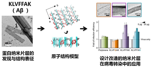 研究团队首次发现了源自阿尔兹海默症关键蛋白Abeta的聚集核心多肽能形成独特的巨型淀粉样纳米片层结构。通过多种生物物理学及计算机辅助模拟等方法,揭示独特片层形成的原子结构基础。基于结构信息,通过定点嵌入功能性氨基酸设计制备出一系列具有提高病毒转染效率的功能性淀粉样片层纳米材料(其效率是商业化病毒转染试剂的二至三倍)。进一步通过设计得到多个具有形成淀粉样纳米片层结构能力的全新人工多肽序列,为淀粉样片层结构更广泛的设计及应用提供了重要的基础。该工作为淀粉样聚集体结构的多样性提供了重要的实验证据,为基于淀粉样生物纳米材料原子结构的合理设计和全新应用提供了方法学的依据和成功的范例。