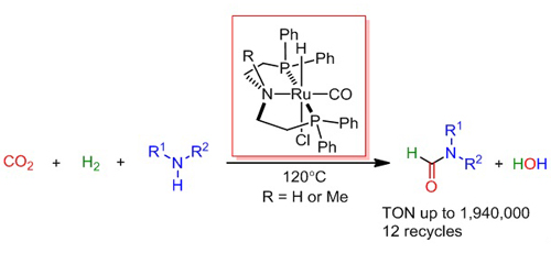 由于二氧化碳的惰性, 如何实现在温和条件下的化学转化是一个极具挑战性的科学问题。通过二氧化碳催化加氢合成精细化学品, 是二氧化碳资源有效利用的一个重要途径。中科院上海有机所金属有机化学国家重点实验室丁奎岭课题组以pincer型钌络合物为催化剂,成功开发了一种以二氧化碳、氢气与有机伯胺或者仲胺为原料,高效合成甲酰胺类化合物的方法。该方法具有反应条件较温和(反应温度为80-120℃、二氧化碳和氢气总压力不高于70 atm)、催化效率高(单釜转化数高达194万)、选择性好以及底物适用范围广等优点。尤其是在N,N-二甲基甲酰胺(DMF,一种万能的溶剂)的合成中,催化剂可以方便地实现重复利用,经12次循环使用,其催化活性仍基本保持不变,显示了该催化体系优异的催化性能及良好的应用前景。