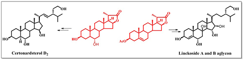田伟生课题组所发展的从甾体-16-羟基-22-酸内酯合成天然胆甾醇的策略也被其他同行关注和应用。姜标课题组已经采用相关合成策略和方法报道了海洋天然甾醇Certonarsterol D2的合成(B. Jiang et al, Tetrahedron, 2008, 64, 469)。最近,俞飚课题组也采用相关合成策略和方法从甾体-16-羟基-22-酸内酯完成了海星多羟基甾体皂甙Linckoside A和B的首次全合成(D. P. Zhu,B. Yu, J. Am. Chem. Soc., 2015, 137, 15098;DOI: 10.1021/jacs.6b00322)。