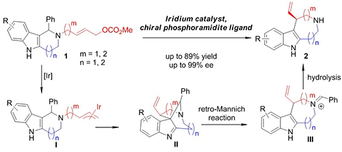中国科学院上海有机化学研究所金属有机化学国家重点实验室游书力研究员团队一直致力于铱催化的不对称烯丙基去芳构化反应研究(Acc.Chem. Res.2014,47, 2558)。2013年,他们发现通过铱催化的分子内不对称烯丙基去芳构化/迁移反应可以高对映选择性地实现多环吲哚(吡咯)结构的构建(J. Am. Chem. Soc.2013,135, 8169)。2015年,他们使用类似的策略完成了螺环吲哚啉类化合物的不对称合成。值得注意的是,当吲哚2位带有取代基时,反应中生成的螺环中间体可以通过逆Mannich/水解反应得到手性色胺衍生物(Angew. Chem., Int. Ed.2015,54, 14146.)。