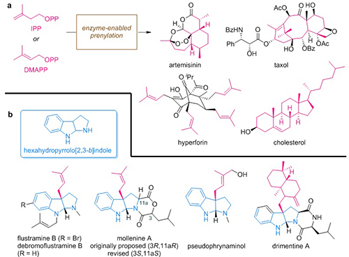 异戊烯基化(prenylation)是生物体内的一个重要过程,很多具有生理活性的天然产物都具有异戊基烯基基团,例如青蒿素、紫杉醇、胆固醇等萜类化合物。除此以外,异戊烯基也可以在酶的催化作用下镶嵌在吲哚等小分子代谢物上,得到一些具有异戊烯基取代的吡咯并吲哚啉结构的生物碱。但是该过程新产生的手性中心通常依赖于手性的天然色氨酸底物;而且由于酶催化反应的专一性等特点,底物范围也比较受限。因此发展新型的催化不对称方法以期高效高对映选择性地构建此类结构具有重要的意义。