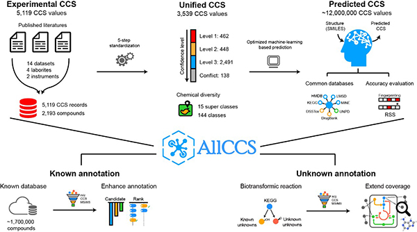 中国科学院上海有机化学研究所生物与化学交叉研究中心朱正江研究员课题组在Nature Communications杂志在线发表了题为“Ion Mobility Collision Cross-Section Atlas for Known and Unknown Metabolite Annotation in Untargeted Metabolomics”的研究论文(https://www.nature.com/articles/s41467-020-18171-8)。该工作发展了基于离子淌度质谱的碰撞截面积数据库(AllCCS),并开发了基于离子淌度质谱的多维代谢物分析技术用于生命体内已知和未知代谢物的化学结构鉴定。朱正江课题组博士生周智伟是论文的第一作者,中国科学院上海有机化学研究所生物与化学交叉研究中心为第一单位。