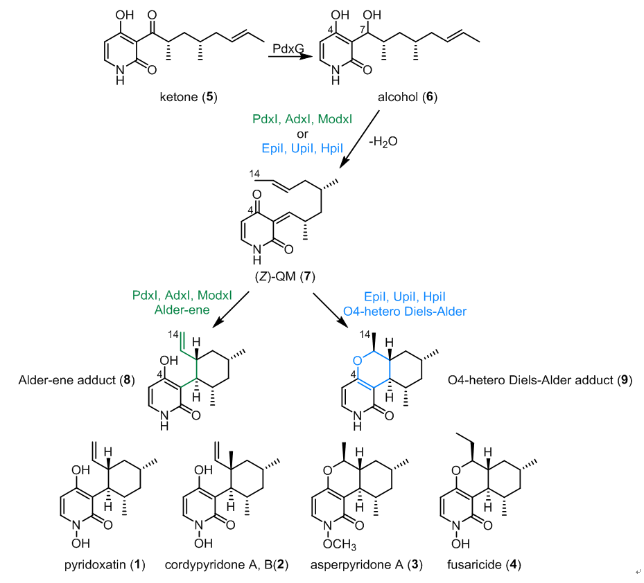 周环反应是指具有环状过渡态的协同反应,这类反应在天然产物合成中常常被应用于高效构建多个碳碳键,而且具有较好的立体选择性和区位选择性。自2011年美国德克萨斯大学Austin分校的刘鸿文课题组首次鉴定出能够催化DA反应的周环酶SpnF后(Nature 2011, 473, 109.),科学家先后从多种天然产物的生物合成途径中鉴定出了不同的新型周环反应酶(Nat. Prod. Rep. 2019, 36, 698.)。2019年,周佳海课题组与唐奕课题组合作,系统地阐释了多功能周环酶LepI立体选择性脱水与催化杂DA反应、逆Claisen重排反应的分子机制(Nat. Chem. 2019, 11, 812.)。