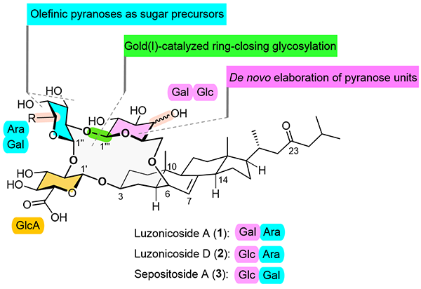 生命有机化学国家重点实验室俞飚课题组对环状海星皂甙的全合成进行了长达十余年的持续研究。他们先后探索了多种合成策略,包括甾环C6β-OH的直接烷基化和大环前体的亲电环化等,皆无功而返。最近,他们提出了一种创新性的合成思路,成功实现环状海星皂甙全合成。合成亮点包括:1)通过温和高效的一价金催化糖苷化反应构建了极具挑战的张力大环结构;2)采用从头(de novo)合成,现场构建了醚键连接的糖单元;3)将烯基糖作为吡喃糖前体,已增加环化反应中受体活性。由于合成路线中采用了从头合成和半合成糖基单元,该路线可以用于发散性合成不同糖基的同系物。该报道中,三种含量较高的环状海星皂甙,即Luzonicoside A、D和Sepositoside A被成功合成。