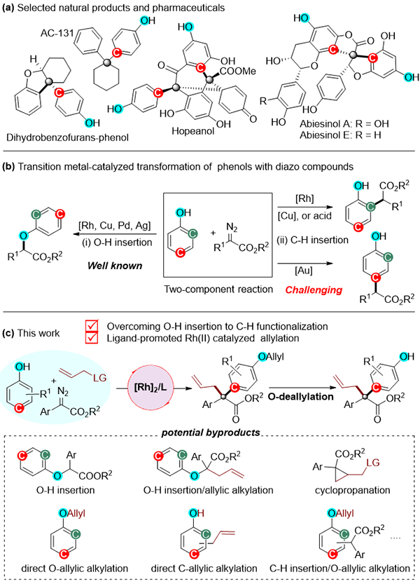苯酚作为一类极其重要的结构单元,广泛存在于天然产物,药物分子和功能材料中。此外,苯酚也是一类重要的合成子,可以进行丰富多样的有机转化。因此,发展基于苯酚的高度选择性的C(sp2)-H键官能团化策略具有重要的意义。其中,通过过渡金属催化的卡宾转移反应实现苯酚的进一步官能团化反应,受到了越来越多的关注。然而,在绝大多数条件下,反应都倾向于发生苯酚的O-H键插入。仅有几例工作报道了金属卡宾与苯酚邻位或对位C(sp2)-H键的直接插入反应。研究团队发现,Rh2(OPiv)4/Xantphos的组合可以高效催化苯酚、重氮化合物与烯丙基化合物的三组份反应,实现苯酚对位碳氢的插入反应和串联的烯丙基烷基化,非常便利地构建了对位季碳中心的苯酚衍生物。该催化体系避免了常规容易发生的苯酚O-H键与金属卡宾的插入反应,以及一些其他副反应。该三组份反应具有较为广谱的底物适用范围和良好的官能团兼容性。药物分子以及天然产物衍生的重氮底物,都能够很好地转化为目标产物。此外,克级规模反应的实现以及产物的后续多样合成转化,进一步说明了所发展方法的实用性和潜在应用价值。初步的机理研究表明,合适的碱的使用对于苯酚与金属卡宾的高度选择性插入过程至关重要,而双膦配体对于后续串联的烯丙基取代反应必不可少。
