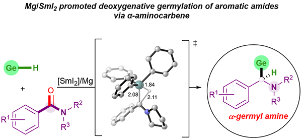 中国科学院上海有机化学研究所金属有机化学国家重点实验室王晓明课题组致力于双多核金属催化和脱氧官能团化反应研究。近年来王晓明课题组发展了多金属介导的单电子还原策略,将酰胺转化为α-氨基卡宾中间体,实现了酰胺脱氧芳基化与脱氧多氟芳基化反应(Angew. Chem. Int. Ed. 2021, 60, 17088–17093; Angew. Chem. Int. Ed. 2022, 61, e202115497)。近期,他们进一步发展了这一体系,成功实现了Mg/SmI2促进的酰胺与锗氢化合物的脱氧锗基化反应(Cell Rep. Phys. Sci. 2022, 10.1016/j.xcrp.2022.101116)。该反应原料易得,条件温和,具有广泛的底物适用范围,可以很方便地制备α-锗基胺类化合物(图1)。结合实验和薛小松研究员课题组合作展开的理论计算,初步推测,惰性酰胺首先生成了α-氨基卡宾中间体,随后发生协同的锗氢键插入过程得到最终的产物。