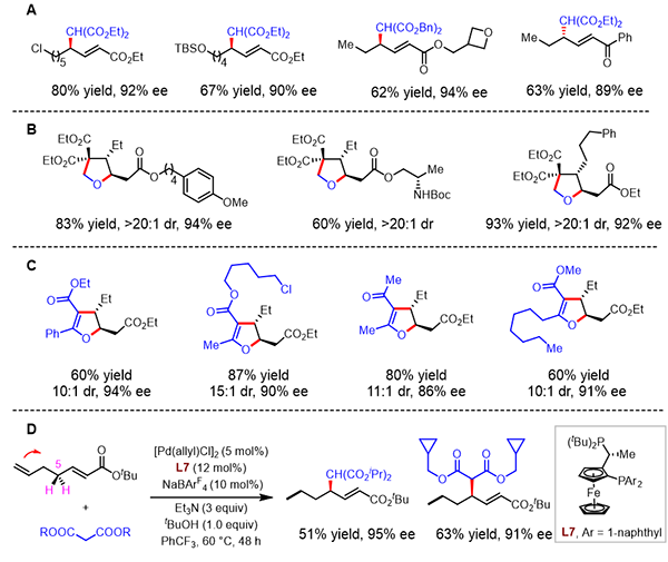 作者通过利用钯氢催化的1,5-共轭加成并结合分子间的 [3+2] 环化,能够高效地构建出一系列光学活性的多取代四氢呋喃环骨架。同时,通过发展钯/有机催化协同控制模式,实现了1,5-共轭加成/分子内 [3+2] 环化的串联历程,一步构建了手性的二氢呋喃环片段。课题组进一步利用非共轭的不饱和酯为底物,实现了迁移1,5-共轭加成反应,进一步证实了该策略的可行性和普适性。