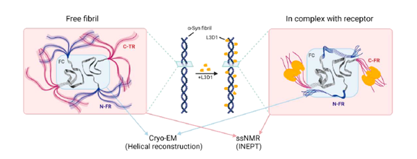 在本工作中,研究者首先利用冷冻电镜技术解析了a-syn纤维刚性纤维核心区(fibril core, FC)的原子结构,其由V37-Q99位氨基酸组成,而高度柔性的N-TR和C-TR在电镜结构中不可见。研究者们进一步利用固态核磁INEPT-based 1H检测技术对a-syn纤维柔性的TRs进行研究,发现a-syn的核心区域形成纤维后,其N-TR和C-TR松散的在a-syn纤维表面分布,并且它们所处的化学环境与其在a-syn单体中非常相似。进一步的核磁滴定实验表明,特异性识别a-syn纤维的膜表面受体LAG3 的D1结构域(L3D1)直接与a-syn纤维中柔性的C-TR结合的。有趣的是,L3D1与a-syn纤维中柔性的C-TR结合后,诱导了原本高度柔性的N-TR会被纤维核心招募而变得刚性,从而形成一个呈现显著纤维表面性质差异的新颖纤维核心构象(图2)。