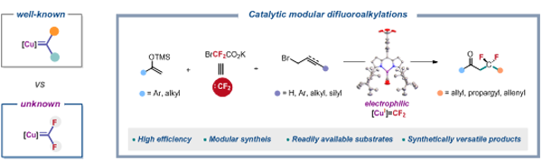 基于对金属二氟卡宾络合物及其相关催化偶联反应的长期研究,张新刚课题组首次利用双金属中心配位以及大位阻配体保护两种策略合成、分离并表征了一价铜二氟卡宾 [CuI]=CF2络合物。这两种策略得到的[CuI]=CF2物种均表现出亲电性,是Fischer型卡宾,与零价钯二氟卡宾[Pd0]=CF2的亲核反应性截然相反;其中单核铜(I)二氟卡宾在LiOTf的存在下,能够作为二氟卡宾源与烯醇硅醚和烯丙基溴发生偶联反应,合成二氟烷基化合物。基于这一性质,该课题组利用氯化亚铜(CuCl)作为催化剂,NaI为添加剂,以简单易得的BrCF2CO2K为二氟卡宾前体,实现了以廉价易得的烯醇硅醚和烯(炔)丙基溴亲电试剂作为反应组分对二氟烷基化合物的高效模块化合成。该铜二氟卡宾参与的催化偶联反应能以低至0.2 mol%的催化剂载量实现十克级放大,具有催化效率高、官能团兼容性优秀、反应体系简单、操作简便和不需要合成复杂含氟试剂等优点;并且所得产物可以作为多功能合成子进行快速转化合成复杂含氟环系化合物,从而为含氟分子的高效合成提供了新思路,也为药物化学提供了高效简便方法。结合基元反应、对照实验、关键中间体的分离和计算化学研究表明:亲电的[CuI]=CF2是该反应的活性中间体,其能够接受亲核试剂的进攻生成新的氟烷基铜物种;该物种不仅能够与烯丙基溴发生氧化加成,还能够再插入一个二氟卡宾,随后通过迁移、β-F消除等过程得到三氟代烯烃。研究还发现添加剂NaI可以通过与CuCl形成盐型铜物种[NaCuCl(I)]延缓BrCF2CO2K释放二氟卡宾,从而提高反应效率。这些发现为铜二氟卡宾化学奠定了重要理论基础,也为二氟卡宾反应性的调控提供了新的路径。