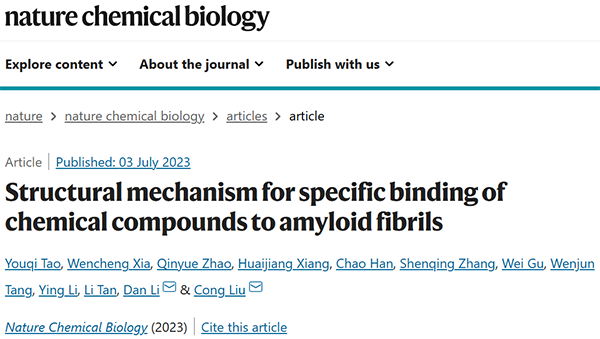 中国科学院生物与化学交叉研究中心刘聪课题组长期聚焦神经退行性疾病关键致病蛋白的相变聚集机制与化学调控研究,一系列工作揭示了淀粉样蛋白纤维结构的高度多态性,阐释了其与蛋白天然构象的本质差别,并揭示了其在帕金森病等神经退行性疾病发展中的关键作用(Nat Chem Biol,2021,17,237;Nat Rev Neurosci,2022,23,523)。近年来,刘聪课题组与上海交通大学李丹课题组合作,进一步聚焦“化学分子如何识别病理蛋白聚集体”这一蛋白相变聚集领域的核心科学问题,通过综合运用结构生物学、化学生物学等研究方法,首次系统地揭示了具有不同结构的小分子化合物与蛋白病理聚集体相互作用的基本原理。相关研究工作于2023年7月3日在Nature Chemical Biology期刊上发表,研究论文的题目为“Structural mechanism for specific binding of chemical compounds to amyloid fibrils”。该工作是对蛋白质-配体相互作用理论的革新,并为神经退行性疾病小分子示踪剂的合理设计和优化提供了结构基础。