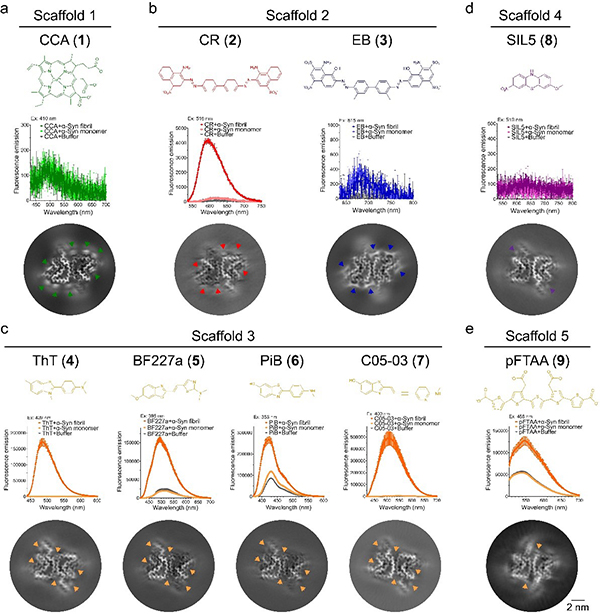 图1 不同小分子与α-syn纤维结合荧光变化和冷冻电镜密度图