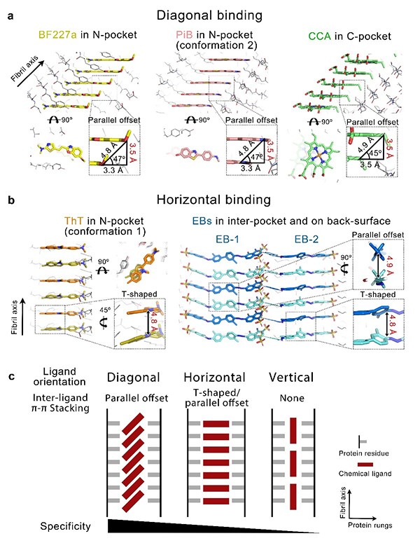 研究人员进一步发现具有不同骨架的化合物能够通过多种不同的取向结合到α-syn纤维的不同结合位点(图2a、2b),并定义了配体识别并结合纤维的三种主要的取向及结合模式:对角线取向(diagonal geometry,小分子平面与纤维轴呈约45o角)、水平取向(horizontal geometry,小分子平面平行于蛋白分子平面)、垂直取向(vertical geometry,小分子平面垂直于蛋白分子平面)。三种取向对应不同形式的配体-配体π-π相互作用,以及依次降低的结合特异性(图2c)。因此,除了传统的配体-蛋白质相互作用,配体-配体相互作用协同贡献了小分子结合淀粉样蛋白纤维的特异性。此外,研究人员在体外重组的α-syn纤维和来自多系统萎缩患者的离体α-syn病理纤维结构中发现了一个可靶向的高度保守的配体结合口袋。为基于此口袋的广谱型α-syn纤维示踪剂设计、筛选和优化提供了重要的设计思路和靶点。