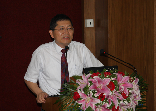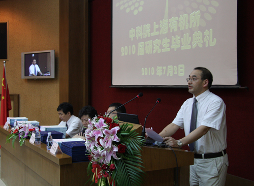 博士生导师唐功利研究员代表导师发言,表达了对2010届毕业生的浓浓祝福和殷切希望,他与在座的全体研究生分享了个人科研工作的深切体会,希望同学们能从未来的工作、生活中收获成功和快乐,成为上海有机所的骄傲。