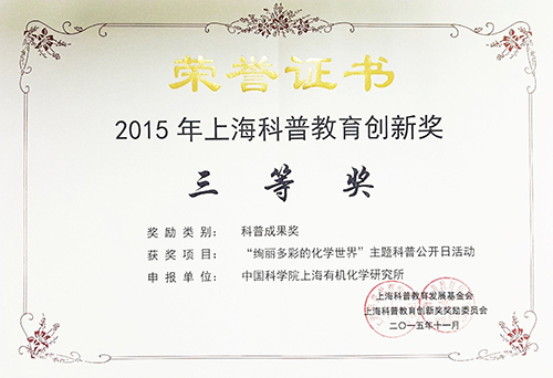 11月8日,“2015上海科普教育创新奖”颁奖典礼在上海儿童艺术剧场举行,上海有机所“绚丽多彩的化学世界”主题科普公开日活动获得上海科普教育创新三等奖(科普成果奖)。