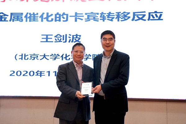 11月2日上午,北京大学王剑波教授应邀来上海有机所作了题为“过渡金属催化的卡宾转移反应”的学术报告。报告在君谋楼一楼报告厅举行,由张新刚研究员主持。
