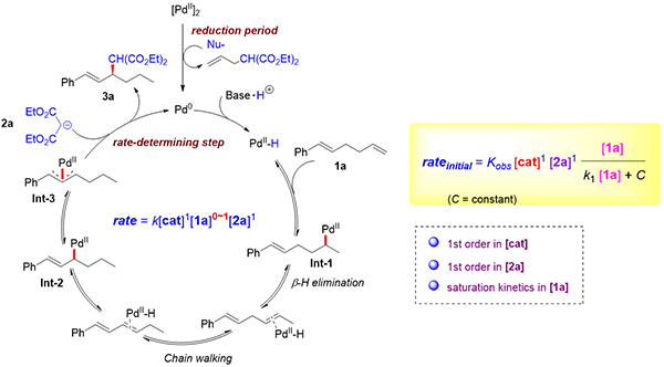 随后作者进一步对反应机理进行了探究(图3)。结合传统的迁移反应和烯丙基取代过程,推测反应可能首先由二价钯在亲核试剂作用下还原形成零价钯启动,然后在碱的作用下被质子氧化形成二价PdH物种。之后与末端烯烃配位继而发生快速链行走过程得到更为稳定的烯丙基钯中间体,再接受亲核试剂的进攻,从而得到烯丙位C-H官能团化的产物,同时再生零价钯完成催化循环历程。具体通过一系列的控制实验、交叉实验、氘代实验以及反应动力学研究,发现在反应初期存在诱导期,为初始零价钯形成过程。该串联过程对于催化剂和亲核试剂均呈现出一级反应,而对二烯底物的动力学符合Micheaelis-Menten模型,即饱和动力学关系。由此推断反应决速步为亲核取代过程。