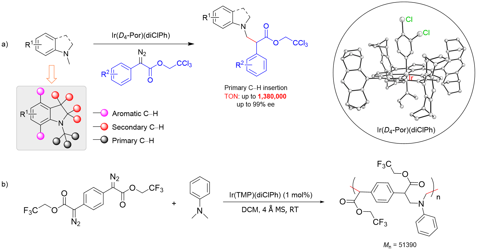 图:铱卟啉催化的 a)不对称碳氢键插入反应和 b)逐步缩聚反应