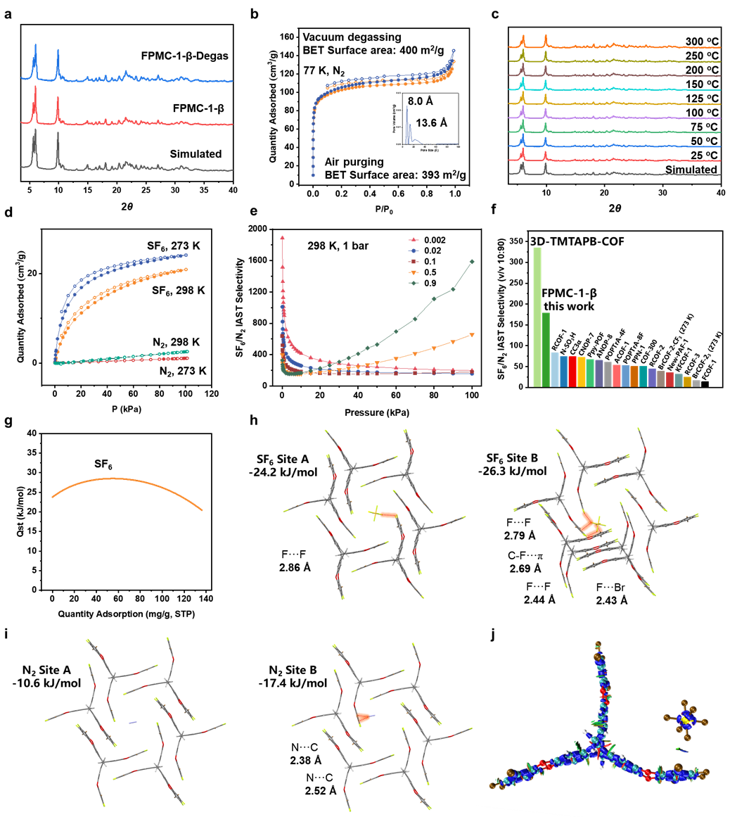图1. FPMC-1-β的结晶性、多孔性热稳定性、SF6吸附分离性能及吸附位点结构