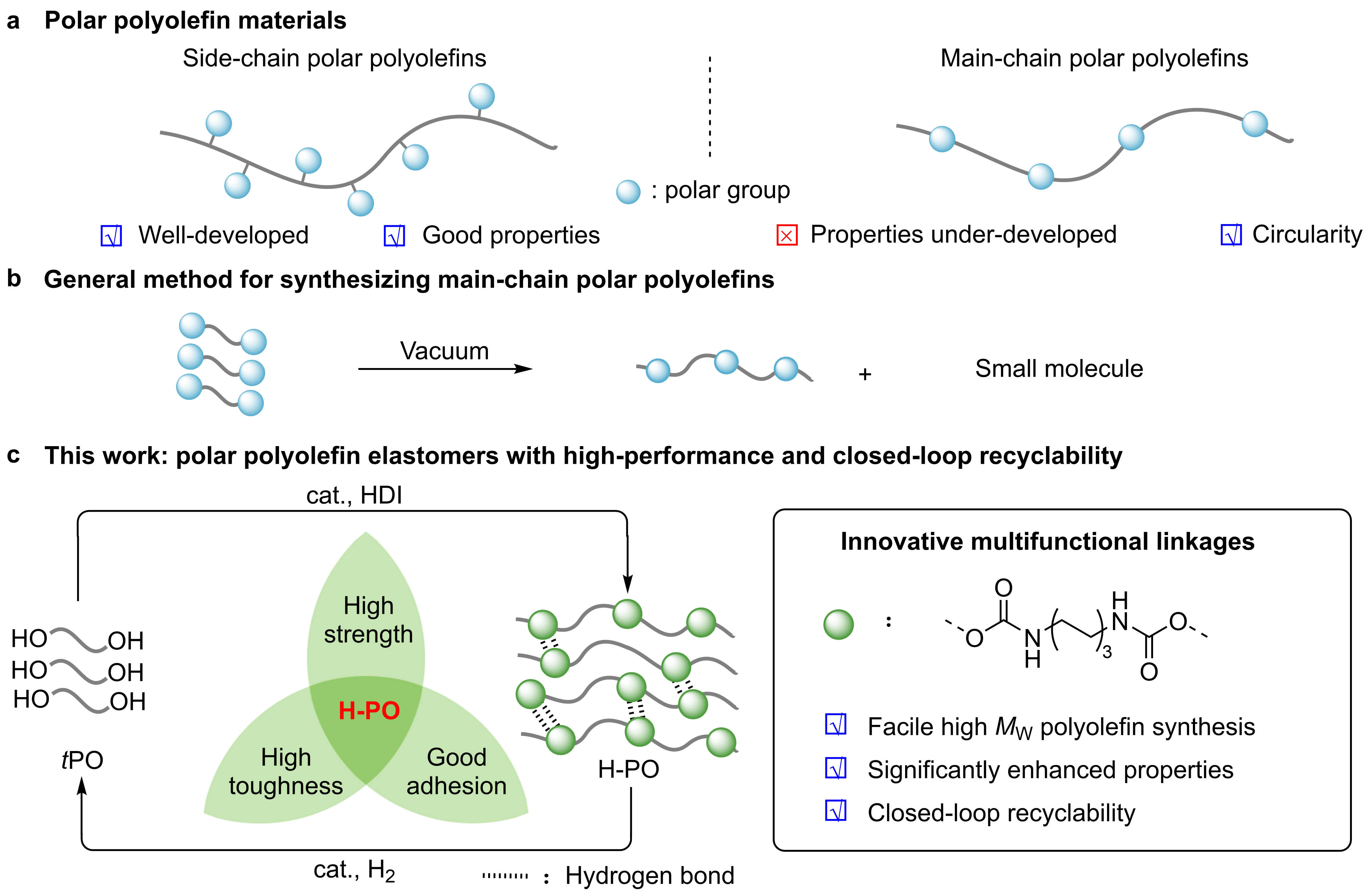 极性聚烯烃因其优异的机械性能、良好的界面相容性和突出的粘附性,已成为一类重要的高性能材料。传统制备方法主要通过后官能团化或极性单体共聚,将极性基团引入聚烯烃侧链,但此类结构通常难以实现化学回收。相比之下,主链型极性聚烯烃通过主链上官能团的化学转化,可实现材料的闭环循环。然而,这类聚合物的合成与性能研究仍相对有限,且常面临合成效率低、分子量不高、力学性能不足等挑战。